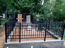 Затем наступил самый ответственный этап работы: монтаж ограждение. Работа по его установке опять-таки заняла достаточно долгое время, однако в результате чего по периметру могилы была установлена достаточно высокая статусная металлическая ограда, сразу же выделяющая место захоронения на фоне других участков. На фотографиях ниже представлен окончательный внешний вид могилы с разных ракурсов на момент завершения работ.