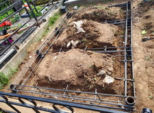 Подготавливаем территорию вокруг места захоронения к покрытию брусчаткой: ввариваем металлическую полосу и укрываем землю геотекстилем.